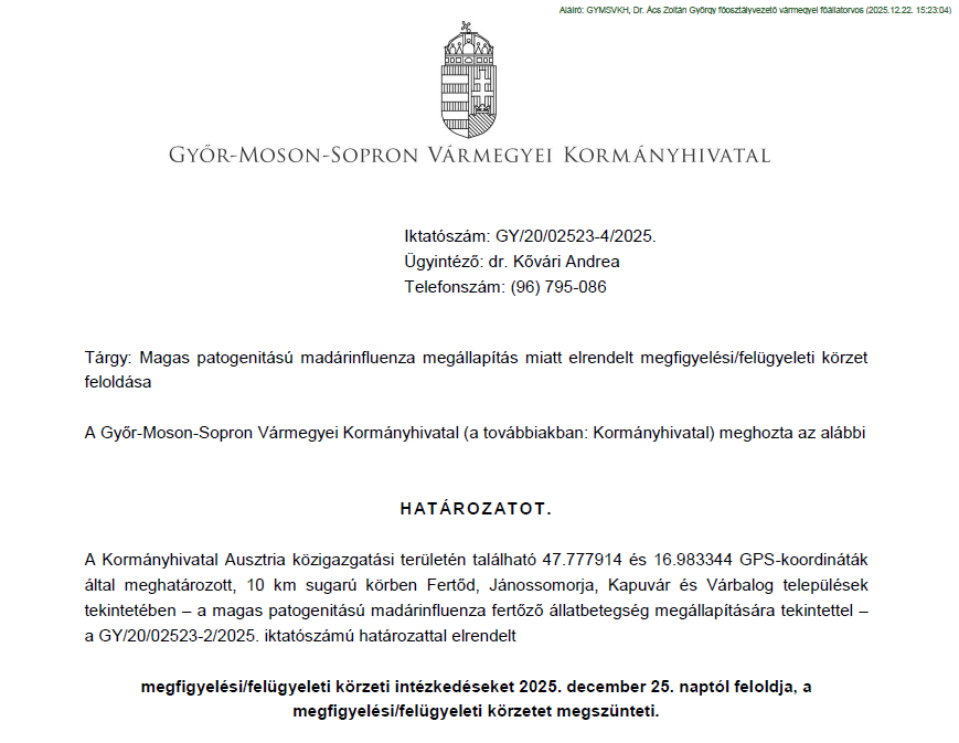 Fertőd, Jánossomorja, Kapuvár és Várbalog közigazgatási területekre vonatkozóan magas patogenitású madárinfluenza fertőző állatbetegség megállapítására tekintettel megfigyelési/felügyeleti körzet elrendelése 2025. november 26-i hatállyal, visszavonásig