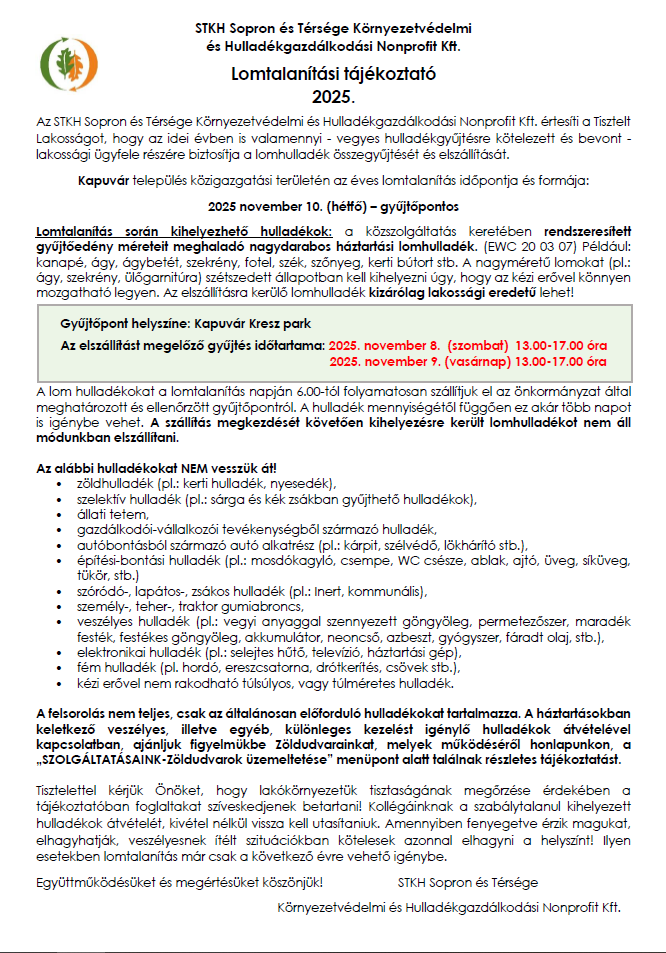 Lomtalanítási tájékoztató 2025.november 8. szombat 13.00-17.00 és november 9. vasárnap 13.00-17.00 2025. október 20. 2024. Február 9-10. 09:00 - 19:00 2024. Február 9-10. 09:00 - 19:00 2025. október 20. Lomtalanítás 2025. november 8., és november 9. Városháza Rendezvénynaptár < 2025. november > H K SZ CS P SZO V 2728293031123456789101112131415161718192021222324252627282930 Választási információk Tudjon meg többet! Városháza hírei Útlezárás Kapuvár, Szent Katalin utca - Ipartelepi út 2025.11.08. (szombat) 7.00 - 19.00 óra között 2025. november 06. A képviselő-testület 2025-10-30-i ülésén megalkotott rendeletek kihirdetése 2025. november 03. Pályázati felhívás a Kapuvár, Hidászi utca 2. szám alatti ingatlan üzemeltetésére A pályázati felhívás ide kattintva megtekinthető. 2025. november 03. Városháza minden hirdetménye