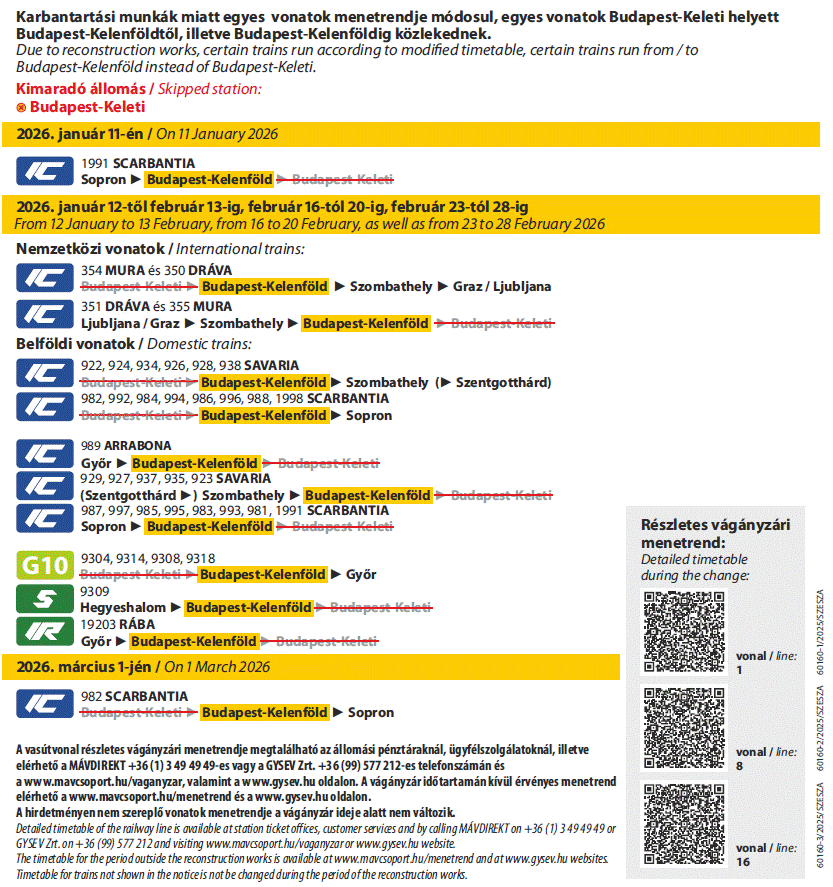 A MÁVCSOPORT tájékoztatása alapján 2026. január 11-én 22:00-tól február 13-ig, február 16-tól 20-ig, valamint február 23-tól március 1-jén 8:00-ig módosul a 1-es sz. vasútvonal menetrendje: