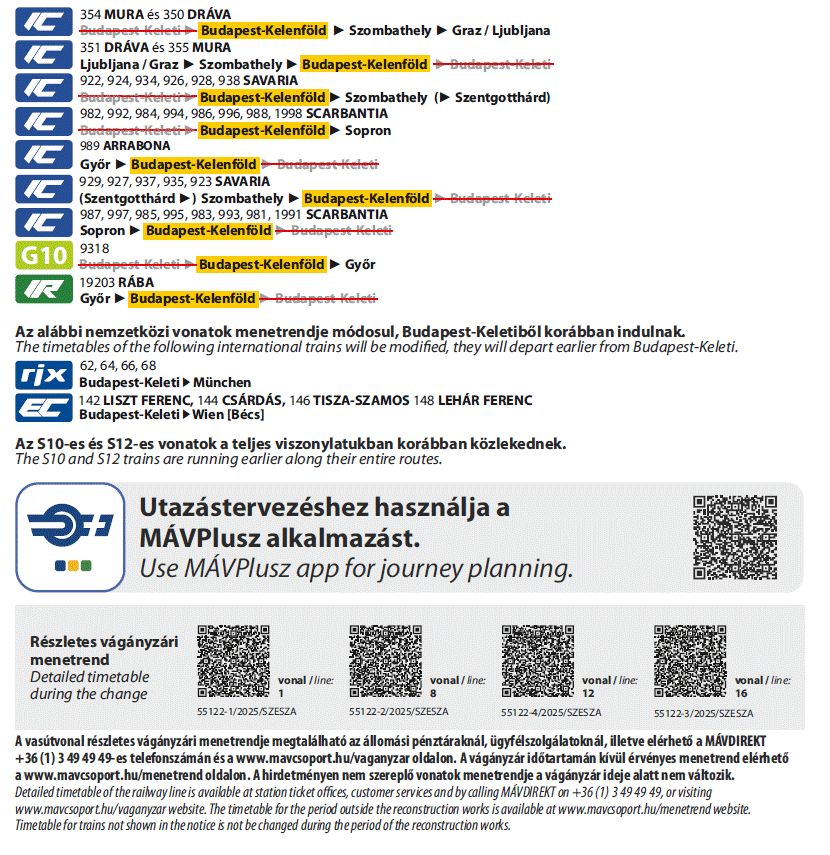 A MÁVCSOPORT tájékoztatása alapján 2026. február 14-től 15-ig és 21-től 22-ig karbantartási munkák miatt egyes vonatok menetrendje módosul, egyes vonatok Budapest-Keleti helyett Budapest-Kelenföldtől, illetve Budapest-Kelenföldig közlekednek.